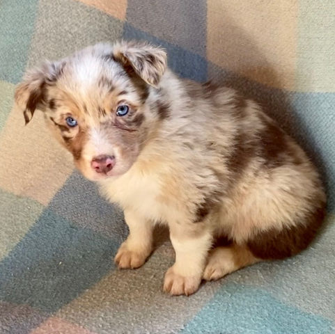 Female. Blue Merle female. Bella has white and copper trim. Front legs and feet are white. Back legs are white and copper. Half collar on top and bottom of neck. Black in merle pattern coloring is mainly on her back quarters, and fades away nicely towards her middle and front. Pleasantly unique. Blue eyes. $950.